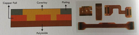 面銅可以使用電鍍或輾壓銅皮,選擇方式依據(jù)應(yīng)用領(lǐng)域不同而定。直接使用銅皮涂膠壓合制作的基材,是所謂有膠基材,部分新式做法是以無膠基材生產(chǎn)軟板,典型的單面軟板結(jié)構(gòu)與成品范例,如圖3-1所示。