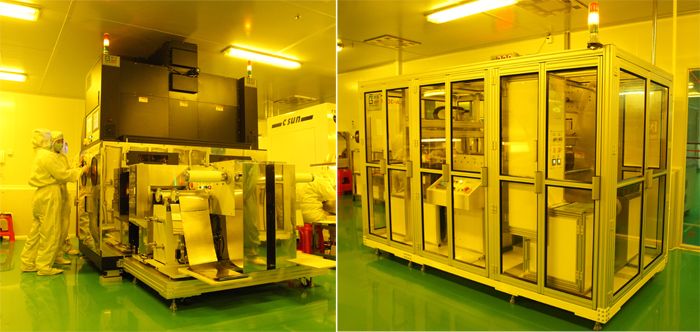 經(jīng)過輾轉(zhuǎn)的運(yùn)輸,馬不停蹄地回到了“娘家“,左圖為雙列單面自動(dòng)曝光機(jī),右圖為片對卷雙面水潤壓膜機(jī)。