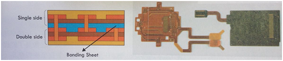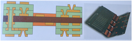 對于同時需要硬板及FPC的產(chǎn)品設(shè)計結(jié)構(gòu),可以采用所謂的軟硬板(Rigid Flex)技術(shù),它混合軟硬板一體并排除端子連接,直接以軟板將不同硬板連結(jié)在一起。典型多層軟硬板結(jié)合產(chǎn)品,如圖所示: