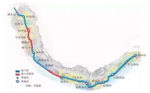 深圳地鐵11號(hào)線全長(zhǎng)51.936千米,于2012年底動(dòng)工,身兼機(jī)場(chǎng)快線和廣深城際軌道線路雙重任務(wù),從福田中心樞紐到車公廟,然后轉(zhuǎn)向?yàn)I海大道的濱海醫(yī)院,從世界之窗后方經(jīng)過(guò)在建的跨國(guó)集團(tuán)總部基地,到南山前海灣,然后直通深圳機(jī)場(chǎng),再到深莞邊界,這條線從市區(qū)到機(jī)場(chǎng)只需要30分鐘。