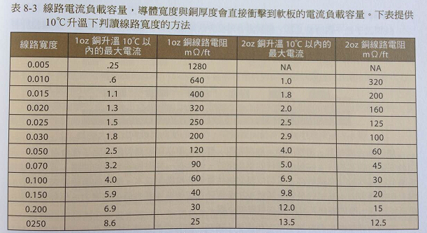 表8-3的內(nèi)容,可以用來(lái)判定35um與2um厚度的銅皮,在不同線(xiàn)路寬度下所可以承載的最大電流與電阻。這些是相對(duì)普遍的銅皮厚度被用在多數(shù)軟板制造上,不過(guò)18um與更薄的銅皮厚度重要性正持續(xù)增加中。