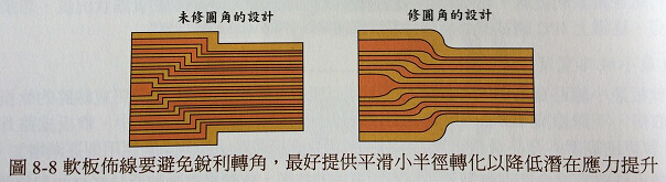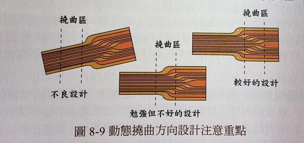 產(chǎn)品加入軟板設(shè)計(jì),可以讓設(shè)計(jì)者一些線路分割,零件組裝的部分可以用支撐方式強(qiáng)化達(dá)成類似硬板的結(jié)構(gòu),這些設(shè)計(jì)的可能性都讓軟板繞線整合技術(shù)應(yīng)用范圍更加寬廣。但是恰當(dāng)?shù)膿锨较騾s是軟板設(shè)計(jì)的重點(diǎn),圖8-9所示為軟板設(shè)計(jì)采用撓曲性的基本考慮方式。