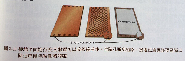 接地區(qū)域,在電性允許狀況下應(yīng)該要進(jìn)行交叉打線的設(shè)計(jì),這種做法可以同時(shí)幫助降低重量與改善軟板撓曲性。接地平面的開(kāi)口尺寸可能是關(guān)鍵,必須搭配產(chǎn)品遮蔽性或特性阻抗控制來(lái)決定。如果開(kāi)口過(guò)大,遮蔽效應(yīng)可能會(huì)受到破壞,這方面會(huì)與頻率相關(guān)。同時(shí)在接地銅面連接元件部分,應(yīng)該要降低熱釋放的狀況,并確認(rèn)可以形成良好的焊錫結(jié)合。這可以利用在襯墊四周蝕刻出空區(qū)來(lái)達(dá)成,不過(guò)仍然要保持電性連接,圖8-11所示,為這個(gè)接地連接技術(shù)的描述。