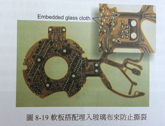 可以在制程中用玻璃布?jí)汉显谵D(zhuǎn)角上,這個(gè)方法經(jīng)過(guò)美國(guó)軍方產(chǎn)品驗(yàn)證相當(dāng)穩(wěn)定有效。不過(guò)它相當(dāng)昂貴,因?yàn)橄喈?dāng)費(fèi)工且需要小心操作,還會(huì)影響到部分FPC柔軟性,目前還在找替代方案(參考圖8-19)。
