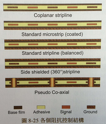 阻抗控制電子訊號傳輸電纜的應(yīng)用,是FPC最適合發(fā)揮能力的應(yīng)用之一。因為高速、高性能的電子產(chǎn)品快速增加,使用阻抗控制互連技術(shù)的產(chǎn)品可以期待會成長。后續(xù)內(nèi)容是一些可以取得的FPC結(jié)構(gòu)類型,圖8-25所示為各個類型的范例。