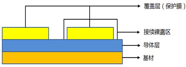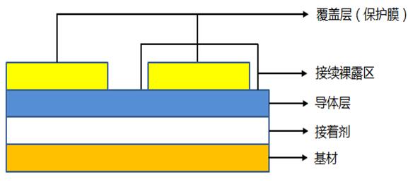 單面板所使用軟板材料分為有膠與無膠兩種,有膠式軟板材料即俗稱3Layer材料,銅箔利用接著劑與軟質(zhì)基材結(jié)合而成,其側(cè)視結(jié)構(gòu)可參考下圖: