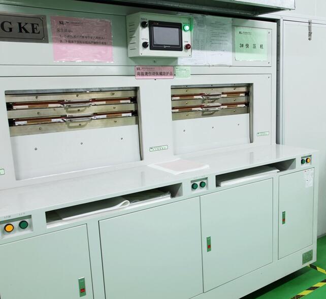 如果壓合采用快壓機(jī),那么適當(dāng)延長預(yù)壓時間 、減少壓力、降低溫度、減少壓合時間,都有利于減少溢膠量。如果是壓機(jī)的壓力不均勻,可以用感應(yīng)紙測試壓機(jī)的壓力是否均勻,可以聯(lián)系快壓機(jī)供應(yīng)商將機(jī)器設(shè)備調(diào)試好。選擇吸膠性能較好的尼氟龍離型膠片、玻璃纖維布、增加硅膠墊片,是改善溢膠量過大的一個重要方式。