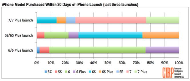 iPhone 6s的情況就差了很多(僅占當(dāng)月銷售iPhone的71%),iPhone 6在其發(fā)售時仍占據(jù)不小的銷量。iPhone 7的情況則要比6s略好一些,但并不如iPhone 6強勢。另外,iPhone 7 Plus的銷量并不如預(yù)期般高,甚至低于去年同期的iPhone 6s Plus。