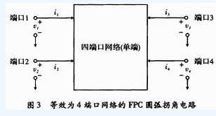 為了分析其全波傳輸特性,輸入輸出的電壓電流可用一個(gè)4端口網(wǎng)絡(luò)來描述,其等效形式如圖3所示。