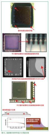 將仿真芯片從聚亞酰胺基材上切割下來(lái),黏合載玻片以加強(qiáng)軟性仿真芯片的結(jié)構(gòu)強(qiáng)度,打上柱形金凸塊,然后以前述的兩種方法(絕緣的熱硬化黏膠接合技術(shù)、導(dǎo)電的熱硬化黏膠接合技術(shù))將仿真芯片與柔性載板接合起來(lái)。由于這個(gè)做在聚亞酰胺基材上的仿真芯片是半透明的,我們能夠以目檢檢視接合的界面。柱形金凸塊看起來(lái)是很平均的被壓縮,這表示平面度控制得很好。對(duì)準(zhǔn)的精確度控制在3微米之內(nèi)。可以看到在黏膠層之內(nèi)有一些空氣氣泡,但是,這些空氣氣泡看來(lái)并不會(huì)影響效能。