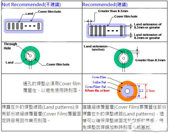 1. 軟板設(shè)計(jì)時(shí)的通孔(Through Hole)、絕緣覆蓋層(Cover Film)、間的尺寸關(guān)係