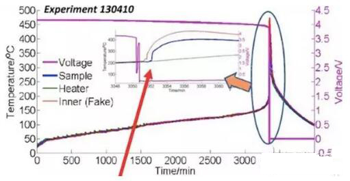 1)外部高溫會導致電芯防爆膜破裂,電解液噴出,會發(fā)生燃燒、起火。在外部高溫環(huán)境下, 電解液分解物與正極、負極發(fā)生反應,電芯隔膜將融化分解等導致內部短路,電能量釋放也多會產(chǎn)生大量的熱量。