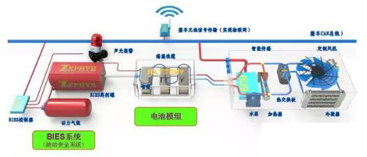 動力電池安全智能系統(tǒng)分為三部分:a)電池系統(tǒng);b)熱管理系統(tǒng);c)自動滅火系統(tǒng)。
