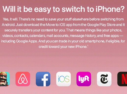 蘋果:“我們早就在Google play上架了數(shù)據(jù)轉(zhuǎn)移APP,你在安卓設(shè)備上的任何信息都能快速且安全的轉(zhuǎn)移到iPhone上”。