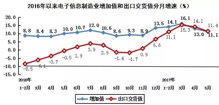 生產(chǎn)實(shí)現(xiàn)較快增長(zhǎng)。1-5月份,規(guī)模以上電子信息制造業(yè)增加值同比增長(zhǎng)13.7%,同比加快4.9個(gè)百分點(diǎn);快于全部規(guī)模以上工業(yè)增速7.0個(gè)百分點(diǎn),占規(guī)模以上工業(yè)增加值比重為7.1%。其中,5月份增速為11.1%,比4月份減緩1.9個(gè)百分點(diǎn)。