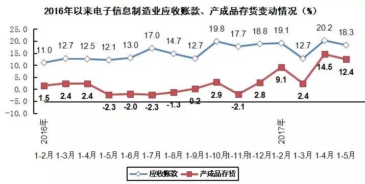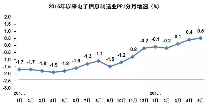 行業(yè)產(chǎn)品價(jià)格延續(xù)上漲趨勢(shì)。5月份,電子信息制造業(yè)生產(chǎn)者出廠價(jià)格(PPI)同比上漲0.5%(去年同期為下降1.8%),延續(xù)3月份以來(lái)持續(xù)上漲的趨勢(shì)。