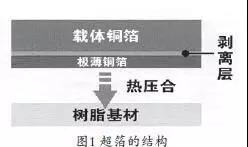 形成模塊基本(IC載板)或智能手機(jī)用的微細(xì)電路圖形,若采用蝕刻工藝由于會(huì)產(chǎn)生側(cè)蝕而影響微細(xì)導(dǎo)體圖形的形成,而采用半加成法或UTC(Ultra-Clad超薄銅箔法)。軟板廠(chǎng)所用UTC法采用的銅箔厚度是3μm左右極薄箔材。通常覆銅板的銅箔厚度即使薄也常是12μm厚,這種12μm厚度的銅箔如作為UTC法之用,也會(huì)產(chǎn)生較大側(cè)蝕而達(dá)不到要求。由于3μm厚的超薄銅箔難于直接使用操作,大都是采用如圖1所示用載體銅箔作襯里的超薄銅箔。將這種材料壓合于基板上以后剝?nèi)ポd體銅箔,然后形成導(dǎo)體圖形。