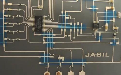 Jabil展示柔性的塑料電路板,使用印刷在柔性基板上的導(dǎo)線和電路,以及安裝在其上的超薄型芯片。