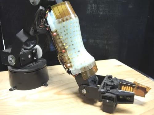 美國史丹佛大學(xué)學(xué)生展示一款包覆一連串傳感器的機器手臂,使其得以在行進中進行偵測與避開物體。
