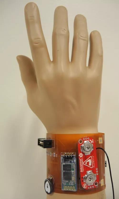 Auburn展示一款安全腕帶,可用于監(jiān)測在危險情況下工作的人員。目前的設(shè)計采用聚酰亞胺基板,但該團隊也正研究如何在其它塑料基板上使用增層印刷以利電路布局。