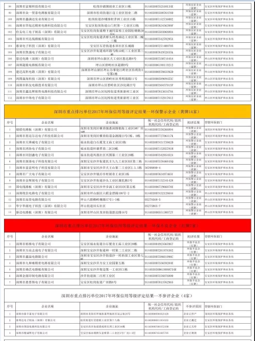 6月7日,深圳市環(huán)境監(jiān)察支隊在深圳人居環(huán)境網(wǎng)上公布了深圳市重點排污單位2017年度環(huán)保信用等級初評結(jié)果,被評定為環(huán)保誠信企業(yè)(綠牌)15家,環(huán)保良好企業(yè)(藍牌)830家,環(huán)保警示企業(yè)(黃牌)151家,環(huán)保不良企業(yè)(紅牌)65家,不參評(含搬遷、關(guān)停)39家、國控重點排污單位省廳尚未公布初評結(jié)果82家。