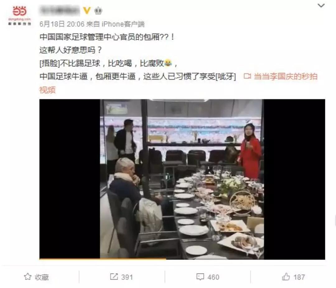 6月18日,網(wǎng)絡上有人曬出名帥米盧和幾位中國人在世界杯的包廂內用餐的視頻,并稱足球管理中心官員伙同米盧在世界杯豪華包廂大吃大喝。一時間,足協(xié)又被推到了風口浪尖。