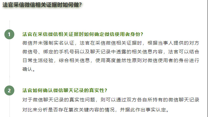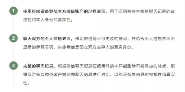 對此,廣州市南沙區(qū)法院表示,為保證聊天記錄證據(jù)的合法有效,當(dāng)事人提交微信相關(guān)證據(jù)需注意以下三方面:
