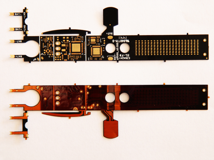 型 號:RM01C00187A層 數(shù):1板 厚:0.12mm材 料:單面有膠電解銅 厚:1/2 OZ表面處理:沉金2微英寸最小線寬/線距:0.1mm/0.08mm特 點:外形復雜