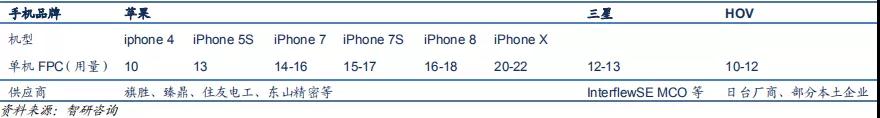 表 1:蘋(píng)果、三星、HOV 單機(jī) FPC 用量及其供應(yīng)商