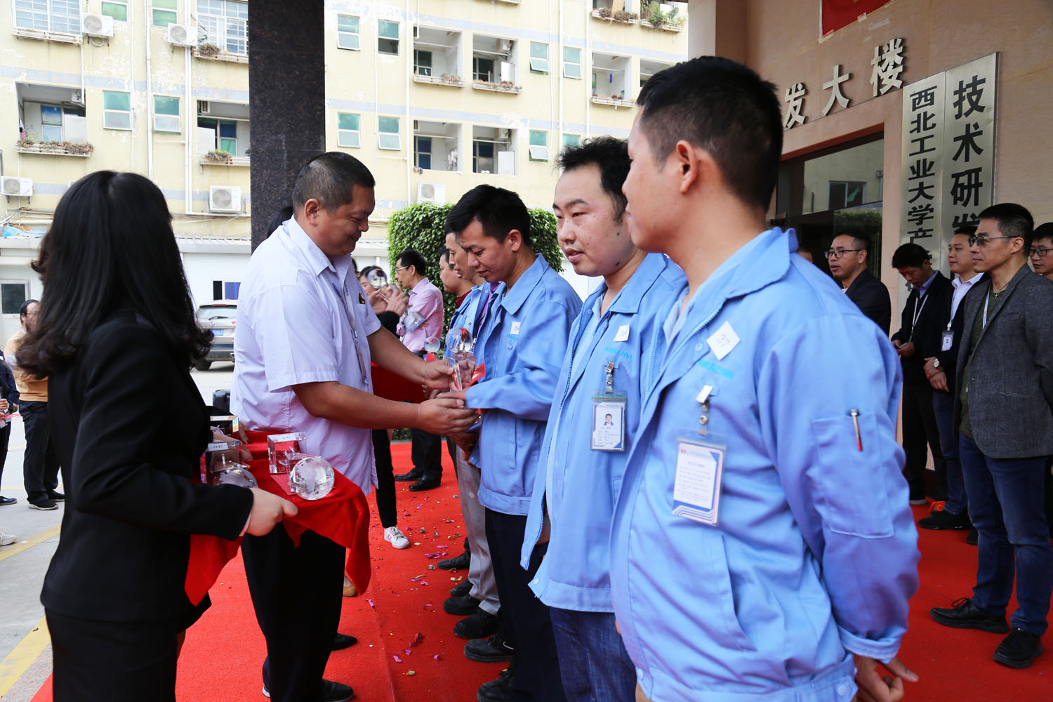 激情昂揚的音樂聲響起,各領(lǐng)導(dǎo)一起為70名職工頒發(fā)榮譽員工獎杯和紅包,大家臉上都洋溢著幸福的笑容。