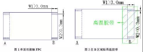 如圖1所示,當(dāng)單面雙接觸的軟板電極長度大于3.0mm,寬度小于0.3mm時(shí),在制程當(dāng)中(蝕刻、去膜、表面清洗、貼保護(hù)膜)容易造成電極變形、扭曲、斷裂,嚴(yán)重影響了產(chǎn)品的良率。
