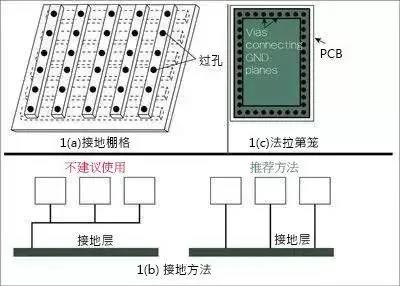 連接所有不同接地并將它們連接到接地層的做法并不可取,這不但會增加電流回路的大小,而且會增加接地反彈的可能性。圖1b提出了將組件連接到接地層的推薦方法。