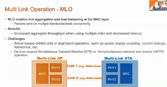 Wi-Fi 7引入的一個(gè)新特性就是上面提到的多鏈路操作(MLO),執(zhí)行MLO時(shí),多個(gè)鏈路公用MAC網(wǎng)絡(luò)層,并采用單獨(dú)的物理層,這樣支持該特性的AP還是基站都能在多個(gè)頻段上同時(shí)執(zhí)行發(fā)射或接收操作,比如5GHz和6GHz。這樣極大地增加了吞吐量,同時(shí)降低了延遲。