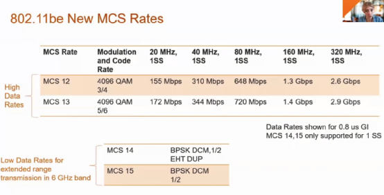 在802.11ax標(biāo)準(zhǔn)中,已經(jīng)為20MHz至160MHz的信道定義了12個(gè)MCS速率,而Wi-Fi 7在4096QAM調(diào)制方式的支持下,引入了速率更高的MCS 12和MCS 13。如果采用320MHz的信道,那么單條空間流上的速率最高可至2.9Gbps。