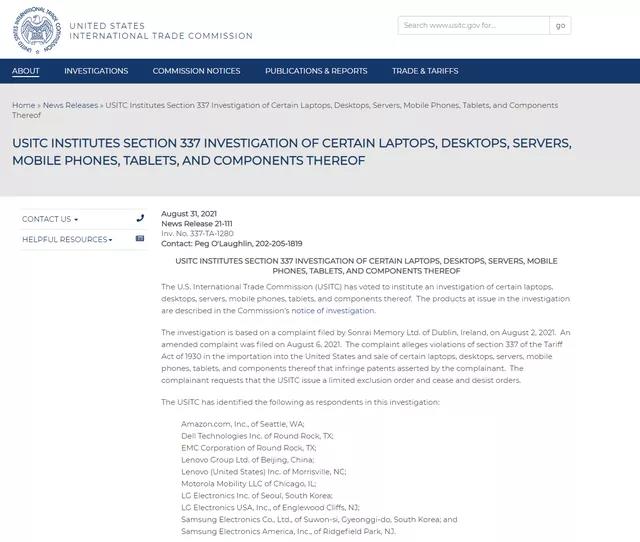 據(jù)柔性電路板小編了解,此次調(diào)查主要由愛爾蘭 Sonrai Memory 發(fā)起申請,聲稱這些公司正在制造或銷售在海外制造的筆記本電腦、臺(tái)式機(jī)和手機(jī),這些筆記本電腦、臺(tái)式機(jī)和手機(jī)侵犯了其三項(xiàng)專利。