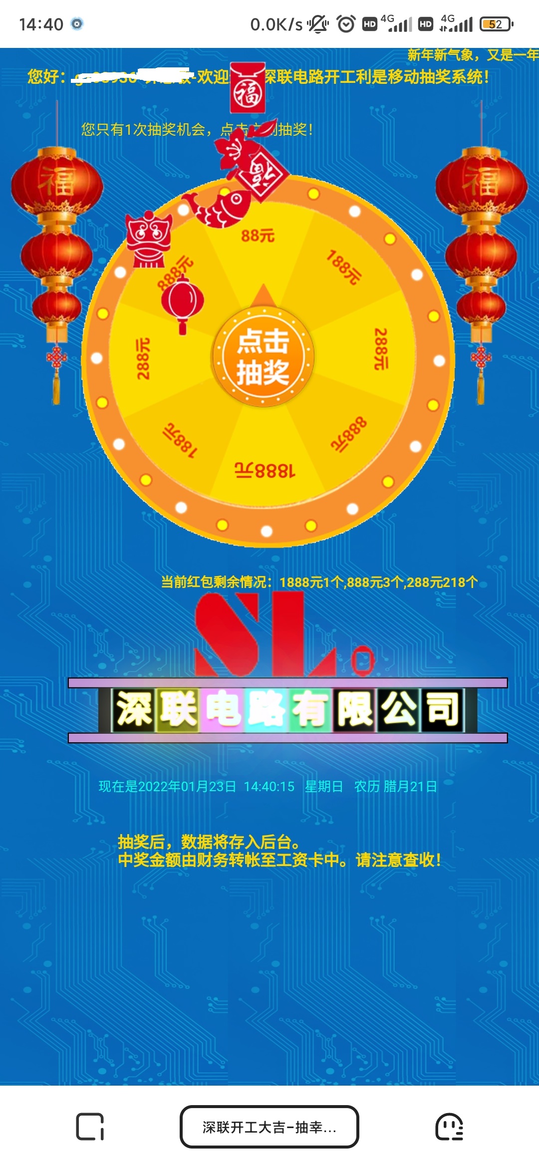 ●中獎名單公示于開工大吉看板中,獎金由財(cái)務(wù)部工作人員轉(zhuǎn)至工資卡中(188元含以上的人員開獎后到一樓大廳頒獎拍照留念哦~)。1888花落誰家?現(xiàn)在轉(zhuǎn)發(fā)錦鯉還來得及~