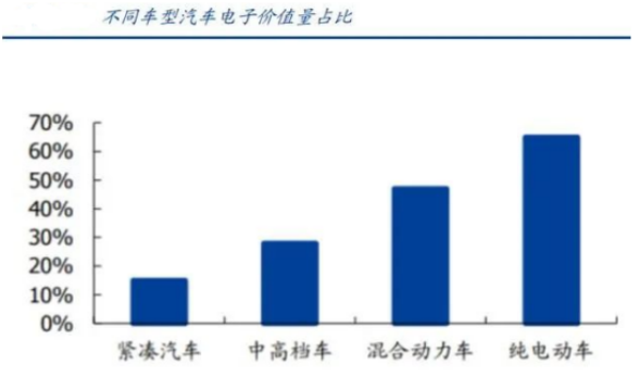 不同車型的汽車電子價值也有差別,純電動汽車和混合動力汽車分別達65%和47%,而低端車型中僅占15%。雖然相比純電動汽車,傳統(tǒng)車型的汽車電子率和價值量相對較低,但中低端汽車本身市場占有率高,未來電子化滲透空間巨大。