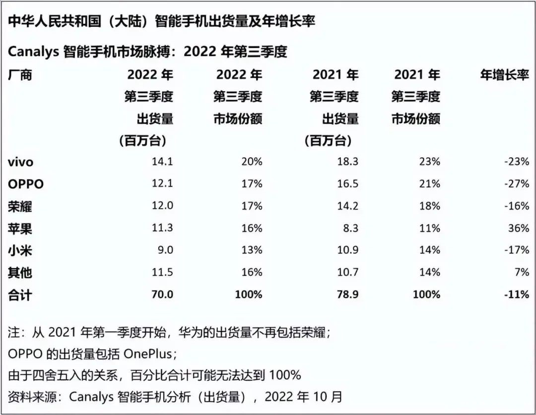 蘋果2022年第三季度在中國智能手機(jī)市場出貨量1160萬臺,同比增長2.5%,市場份額15.1%排名第四。蘋果本季度的排名上升 一位,也是TOP5中唯一保持同比增長的廠商。