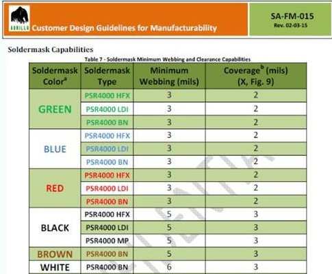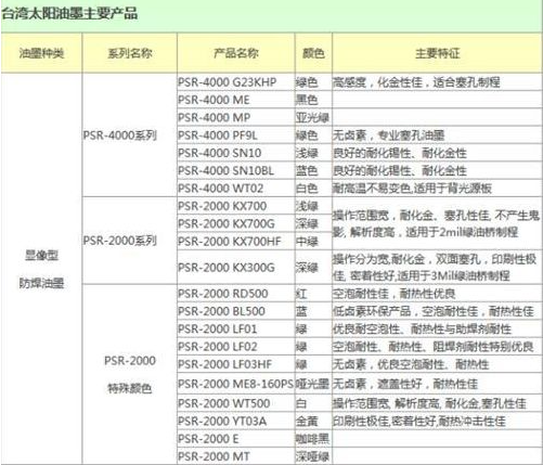 以上是太陽(yáng)油墨產(chǎn)品特性表,可以發(fā)現(xiàn),綠色油墨比起其他顏色的油墨,具有更好的特性,尤其綠色的塞孔特性。