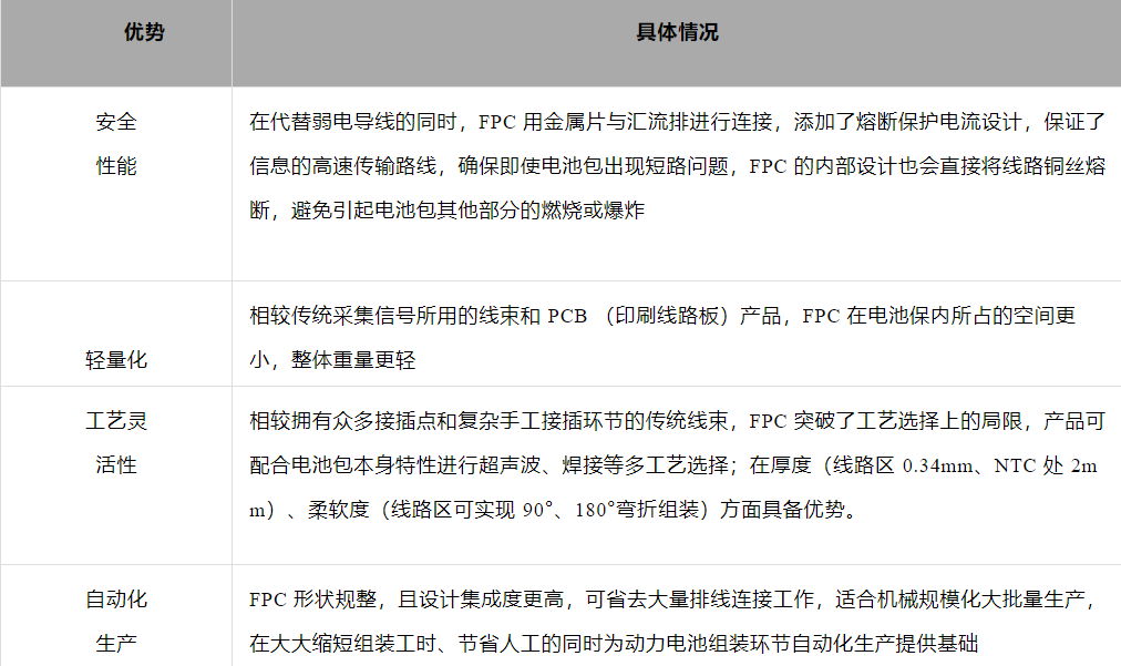 相較銅線線束,F(xiàn)PC 由于其高度集成、超薄厚度、超柔軟度等特點(diǎn),在安全性、輕量化、布局規(guī)整等方面具備突出優(yōu)勢(shì),此外 FPC 厚度薄,電池包結(jié)構(gòu)定制,裝配時(shí)可通過機(jī)械手臂抓取直接放置電池包上,自動(dòng)化程度高,適合規(guī)?;笈可a(chǎn),F(xiàn)PC 替代銅線線束趨勢(shì)明確。