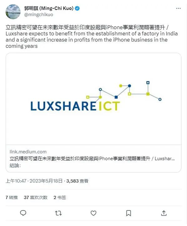 軟板廠深深了解到,知名蘋果分析師郭明錤預期蘋果將協(xié)助立訊精密在印度設立產線,立訊精密有望在未來數年內受益于印度市場與供應鏈的成長。