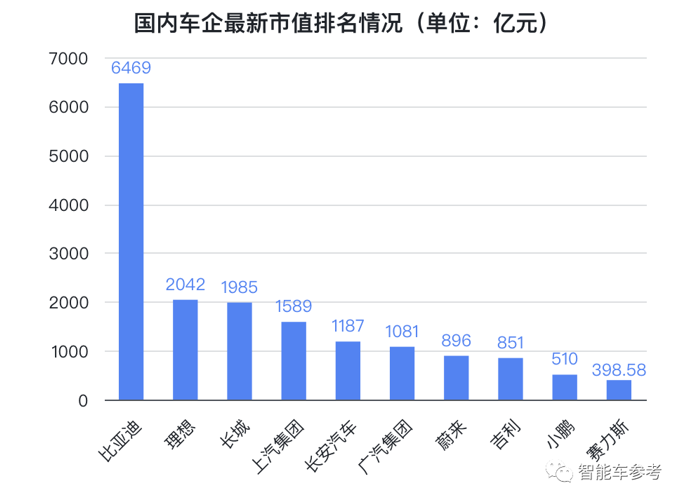 從國(guó)內(nèi)車企市值最新排名情況來看,目前表現(xiàn)為:比亞迪第一、理想第二、長(zhǎng)城第三。