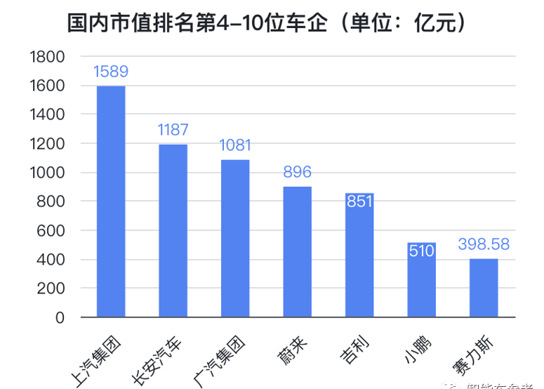 除了前三名以外,最新數(shù)據(jù)顯示,市值排在全國(guó)第4-10的依次是:上汽集團(tuán)、長(zhǎng)安、廣汽集團(tuán)、蔚來、吉利、小鵬、賽力斯。