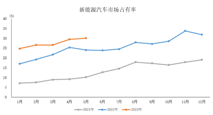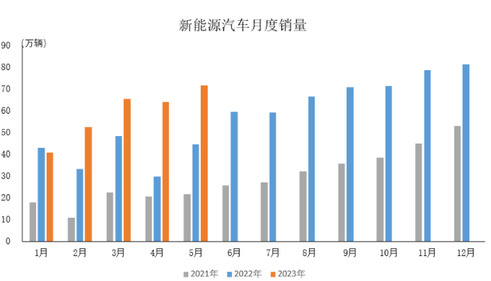 其中,5月新能源汽車產(chǎn)銷分別完成71.3萬輛和71.7萬輛,環(huán)比分別增長11.4%和12.6%,同比分別增長53%和60.2%,市場占有率達(dá)到30.1%。