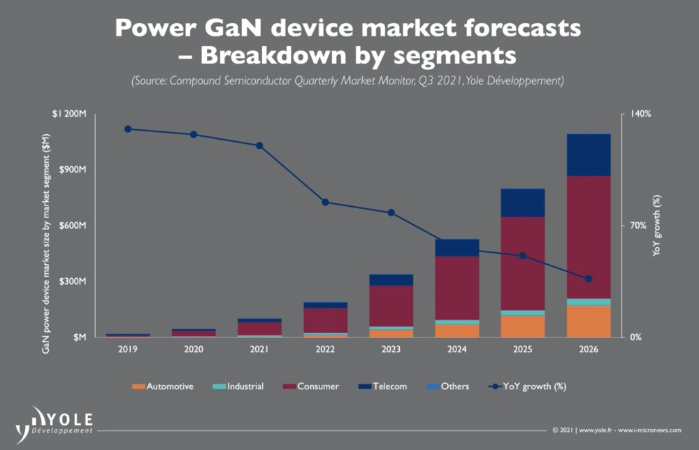 目前國內(nèi)GaN功率元件市場的發(fā)展主要由消費電子所驅(qū)動,關(guān)鍵應(yīng)用為快速充電器,以及音頻、無線充電、電源和其它消費級產(chǎn)品等應(yīng)用場景。據(jù)預(yù)測,到2026年,氮化鎵功率器件市場規(guī)模將增長到13.3億美元,復(fù)合增長率達到65%。此外,數(shù)據(jù)中心和汽車市場也是氮化鎵產(chǎn)品的重要潛力領(lǐng)域,它們可以通過應(yīng)用氮化鎵產(chǎn)品來降低電力消耗和成本。