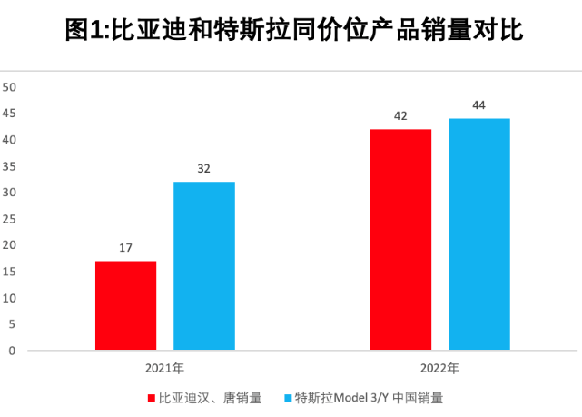 2022年,特斯拉銷量增速放緩,訂單量下降;比亞迪則銷量翻倍;在二者正面交手的20萬—30萬元細分市場,比亞迪的漢、唐的銷量已經(jīng)與特斯拉Model 3和Model Y銷量之和相差無幾。