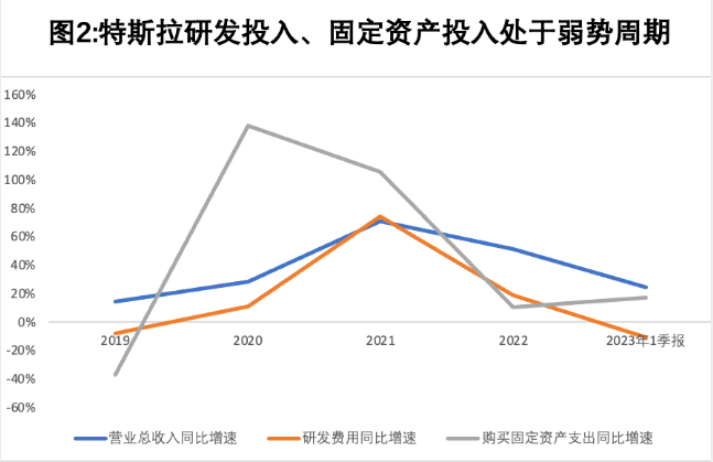 投入節(jié)奏變得保守:2022年和2023年1季度,固定資產(chǎn)投資僅增長了10%和17%;研發(fā)費用2022年同比增長18.6%,2023年1季度同比還有所下降,增速均落后于銷量和營收增幅。