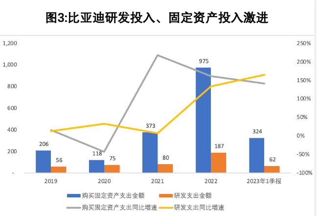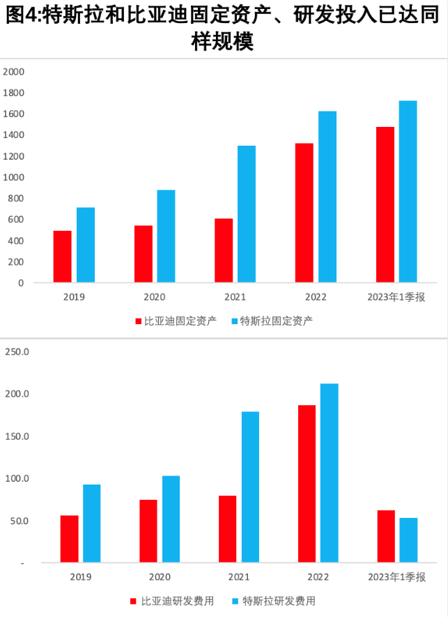 比亞迪的研發(fā)費用,從2019年到2021年的年均值為70億元,2022年達到186.5億元,2023年1季度為62.4億元,是上年同期的2.6倍。2023年1季度,比亞迪的研發(fā)費用已經(jīng)反超特斯拉,固定資產(chǎn)總額已接近特斯拉。