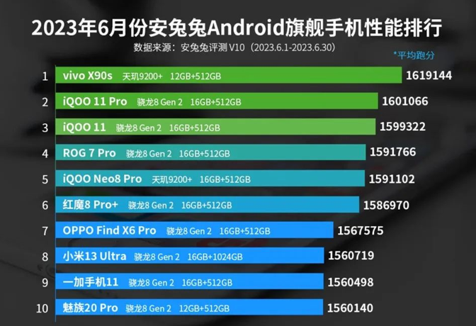 先從榜單來看,高端旗艦性能機(jī)型還是蠻多的,其中包括vivo X90s、iQOO 11 Por、iQOO 11、ROG7、iQOO Neo8 Pro、紅魔8 Pro+等。