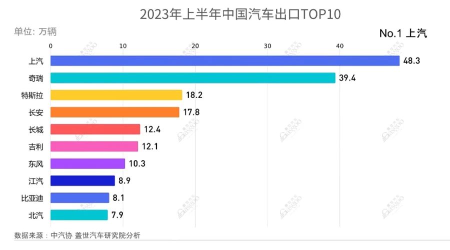 盡管中國汽車出口一度受到了特斯拉等外資車企的拉動(dòng),但據(jù)蓋世汽車統(tǒng)計(jì)數(shù)據(jù),2023年上半年中國汽車出口十大車企依次為:上汽48.3萬輛,奇瑞39.4萬輛,特斯拉18.2萬輛,長安17.8萬輛,長城12.4萬輛,吉利12.1萬輛,東風(fēng)10.3萬輛,江汽8.9萬輛,比亞迪8.1萬輛,北汽7.9萬輛??梢?,還是以中國本土車企出口為主。而這個(gè)巨大的變化,僅僅發(fā)生在幾年間。